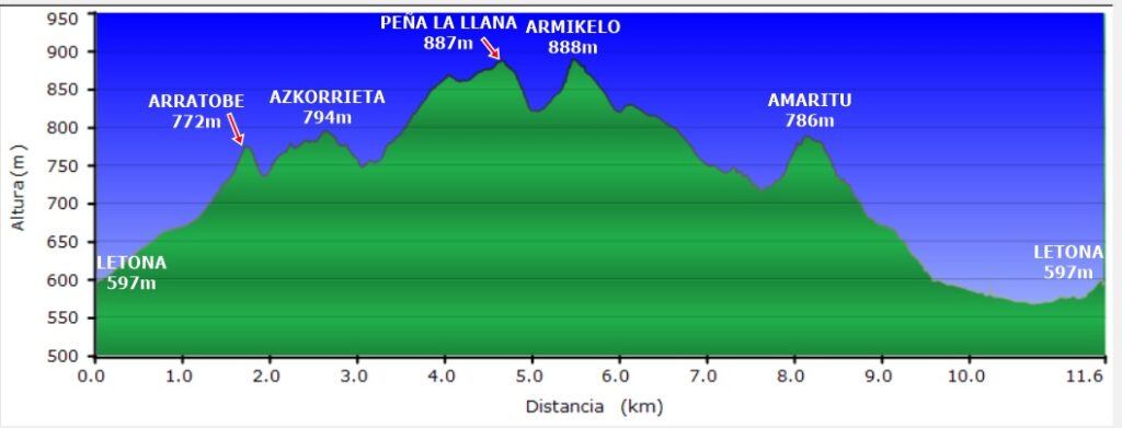 Recorrido circular desde Letona pasando por las cimas de Arratobe (772m), Azkorrieta (794m), Peña La Llana (887m), Armikelo (888m) y Amaritu (786m). (ver oharrak).