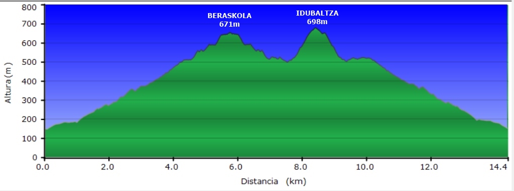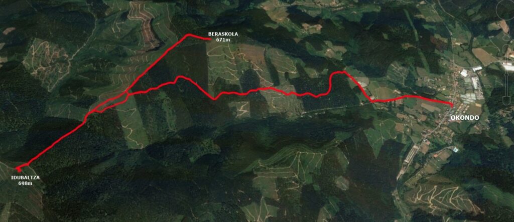 Irteera Okondotik (149m), Beraskola (671m) eta Idubaltza (698m) gailurrekin pasatuz, eta helduera Okondora (149m). Igoera eta jaitsiera bide beretik eta ibilbide zirkular txikia tontorren ondoan.