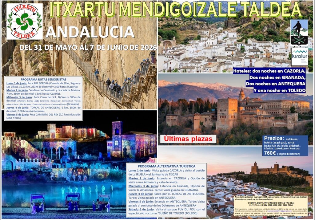 Éste es el especial viaje que Itxartu Mendigoizale Taldea, dentro de su calendario anual, organiza este año con motivo del 50 aniversario de Itxartu Taldea por ANDALUCIA con el siguiente recorrido (CAZORLA, GRANADA, ANTEQUERA Y EL PUY DU FOU (parque temático situado en TOLEDO).