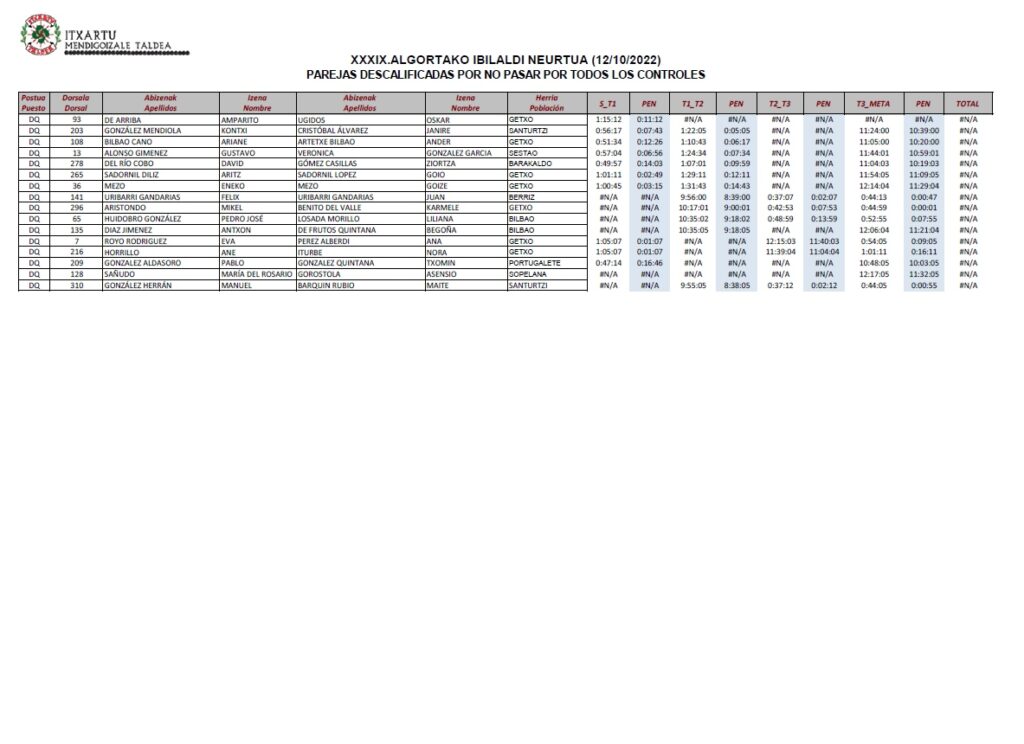 El no pasar por algún control supone la descalificación de la pareja. Asimismo es obligatorio que los dos componentes de cada pareja pasen juntos por todos los controles, siendo también descalificados los que no lo hagan así.