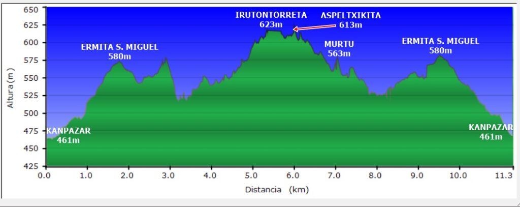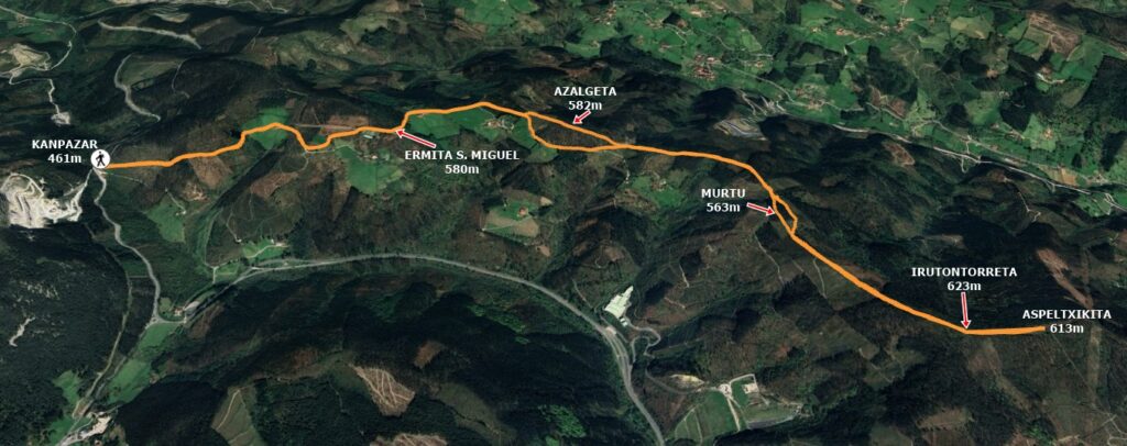 Recorrido circular desde Kanpazar pasando por las cimas de Irutontorreta (623m), Murtu (563m) y Azalgeta (582m). (ver oharrak).