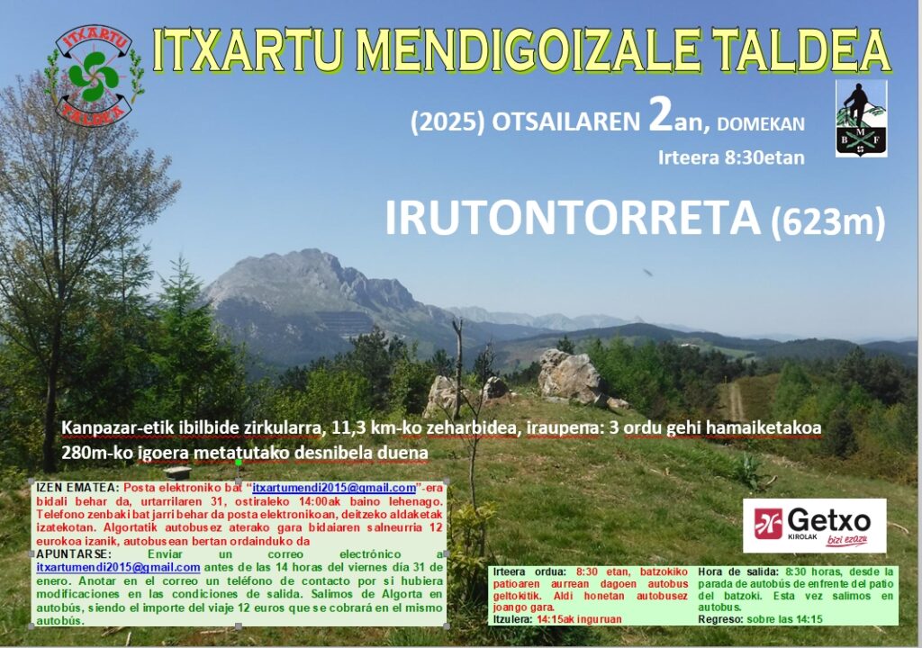 Eguraldi iragarpenak eta ezarritako alertak (abisu laranjak haize bortitzengatik) direla eta urtarrilaren 26rako, iganderako, Irutontorretako irteera otsailaren 2ra aldatzea erabaki dugu.