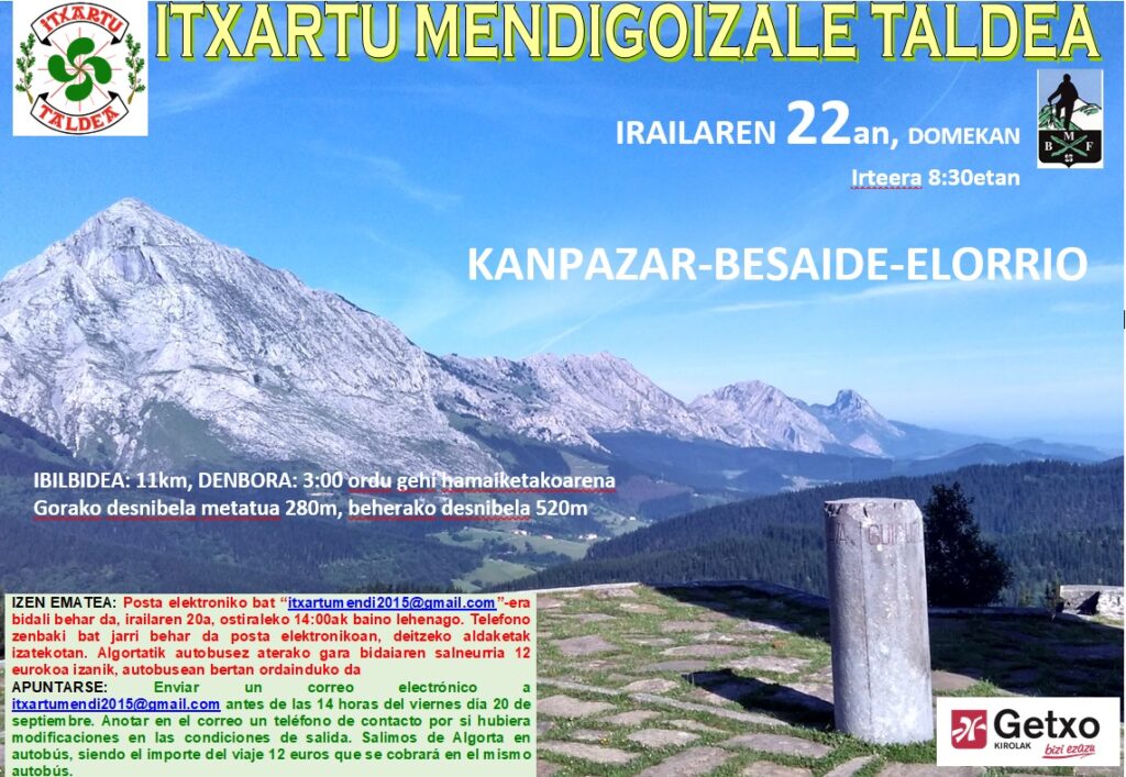 Enviar un correo electrónico a itxartumendi2015@gmail.com antes de las 14 horas del viernes día 20 de septiembre. Anotar en el correo un teléfono de contacto por si hubiera modificaciones en las condiciones de salida. Salimos de Algorta en autobús, siendo el importe del viaje 12 euros que se cobrará en el mismo autobús.