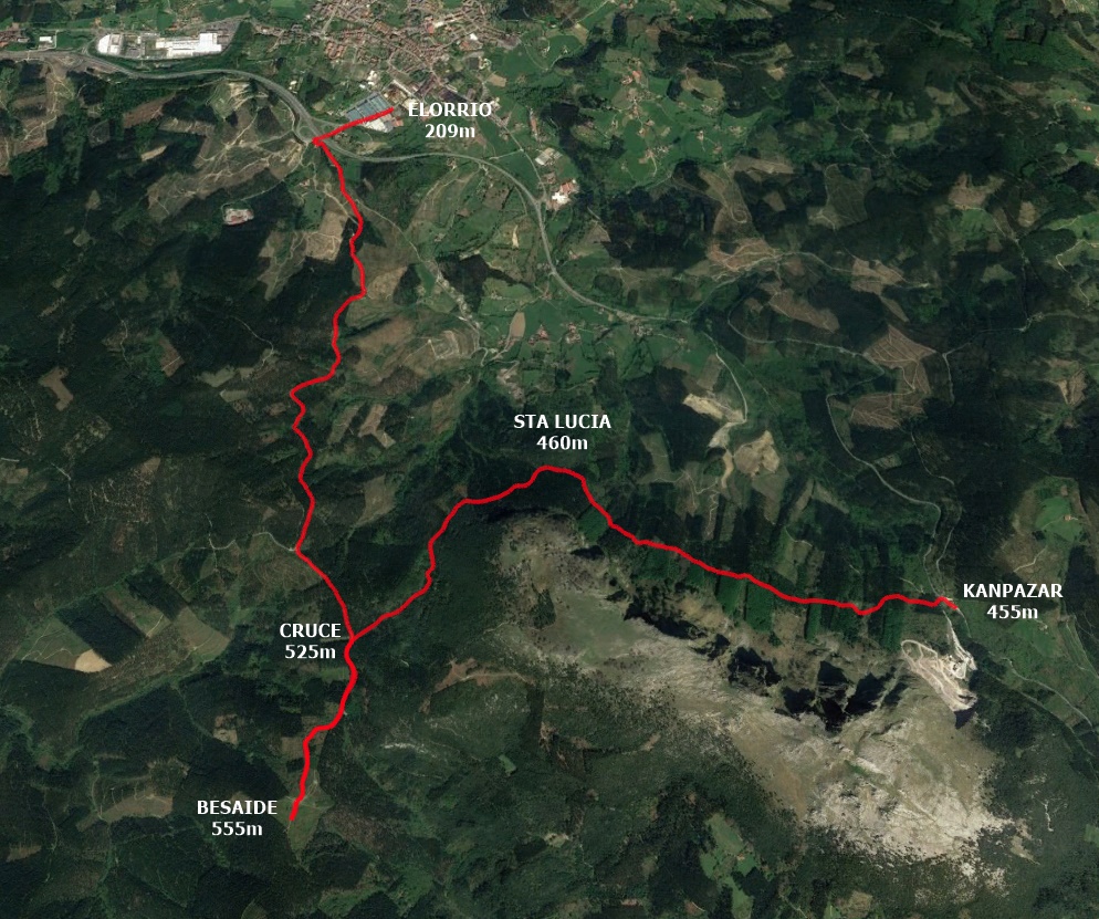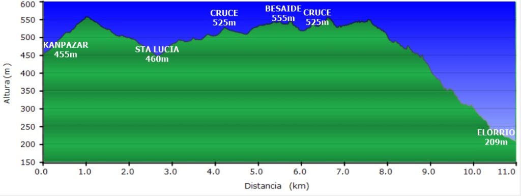 Irteera, Kanpazar mendatetik (455 m.) –Sta Luzia (460 m.) – Besaide (555 m.) eta Elorriora helduera (209m), ikusi oharrak.