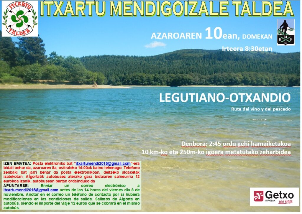 Enviar un correo electrónico a itxartumendi2015@gmail.com antes de las 14 horas del viernes día 8 de noviembre. Anotar en el correo un teléfono de contacto por si hubiera modificaciones en las condiciones de salida. Salimos de Algorta en autobús, siendo el importe del viaje 12 euros que se cobrará en el mismo autobús.