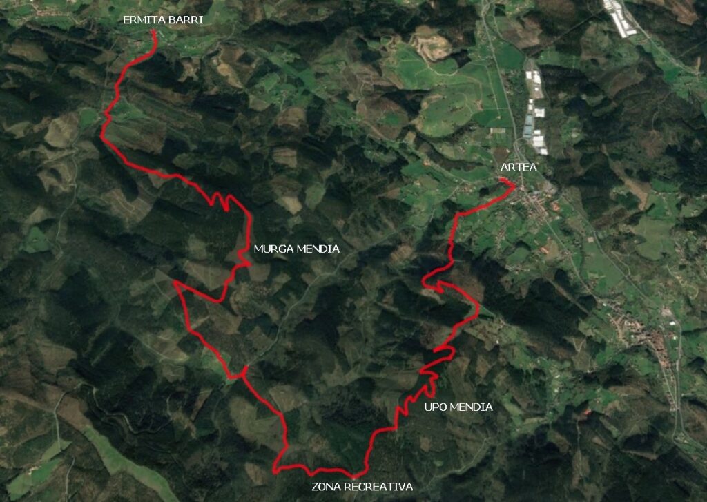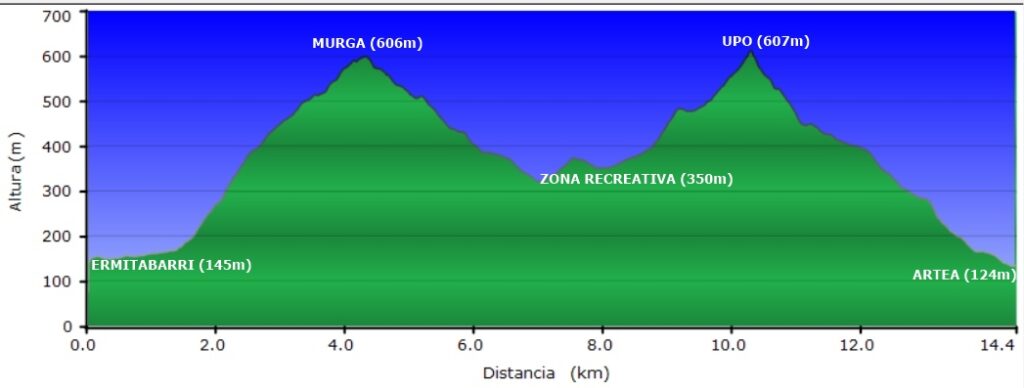 Irteera, Ermitabarritik (Zeberio) (145m.) – Murga gaina (606 m.) – Aisiarako zona (350 m.) – Upo gaina (608 m.) eta Arteara (124 m). helduera.