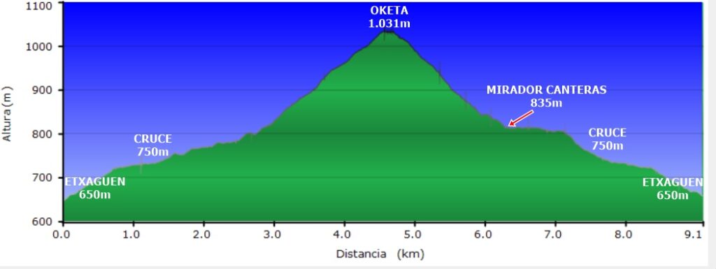 Irteera, Etxaguenetik (650 m.) –Oketaren gailurra (1.031m) eta Etxaguenera itzulera (ibilbide zirkularra), ikusi oharrak.