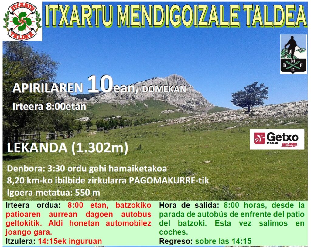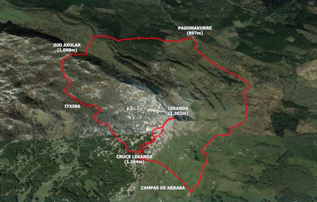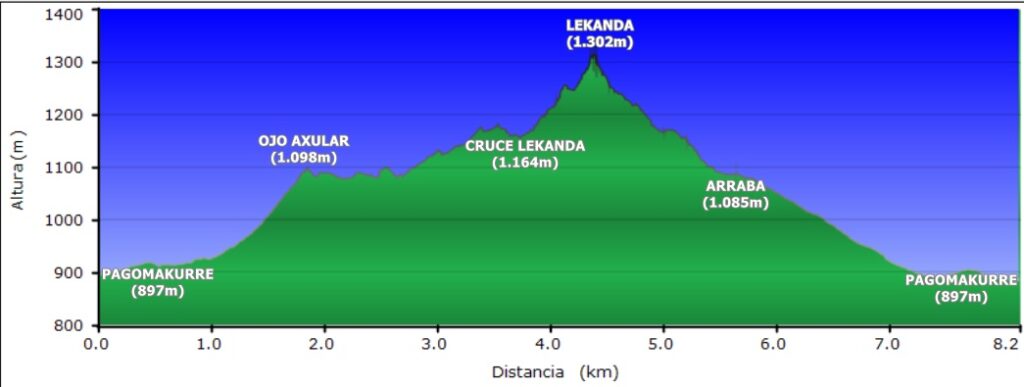 Irteera Pagomakurretik (897m), Begi Axular (1.098m), Itxina eta Lekanda tontorretik (1.302m) pasatzen, jaitsieran Arrabatik (1.085m) igaro (hamaiketakoa) eta Pagomakurrera itzuli.