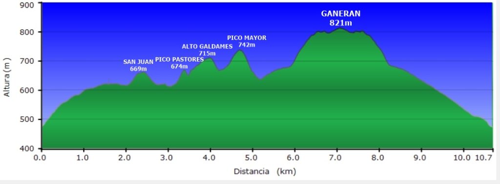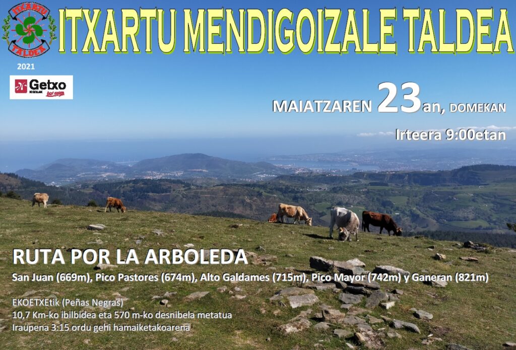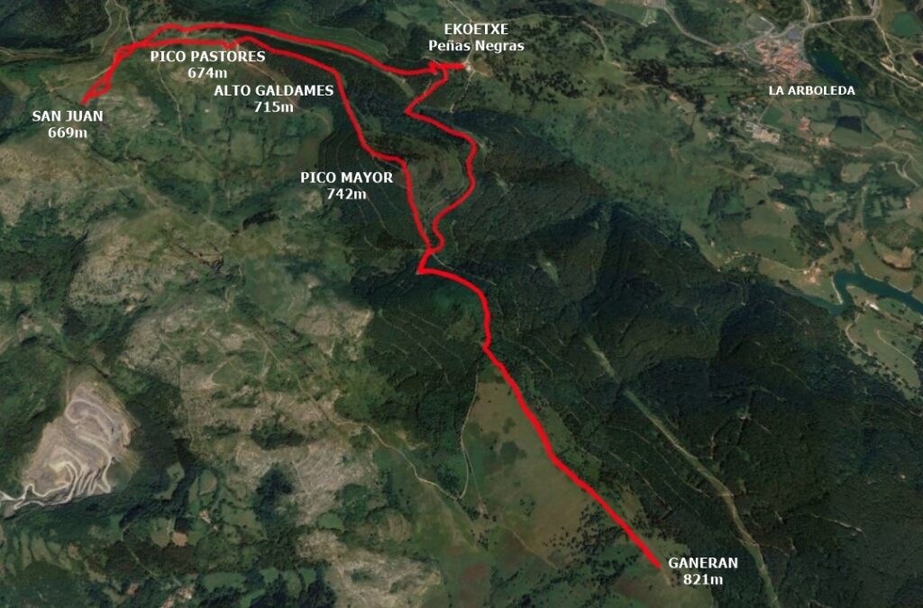 Irteera EKOETXEAtik (Peñas Negras) (479m), San Juan (669m), Pico Pastores (674m), Alto Galdames (715m), Pico Mayor (742m), eta Ganeran (821m) gailurrekin pasatuz, eta helduera EKOETXEAra (479m).