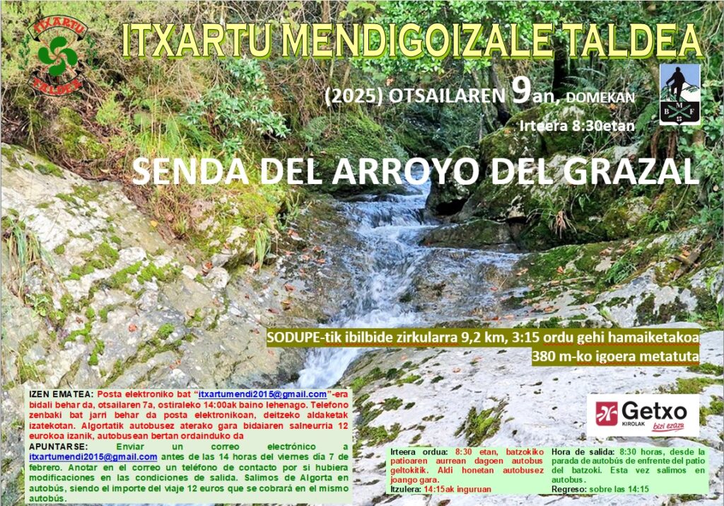 Enviar un correo electrónico a itxartumendi2015@gmail.com antes de las 14 horas del viernes día 7 de febrero. Anotar en el correo un teléfono de contacto por si hubiera modificaciones en las condiciones de salida. Salimos de Algorta en autobús, siendo el importe del viaje 12 euros que se cobrará en el mismo autobús.