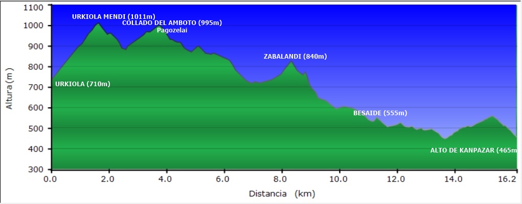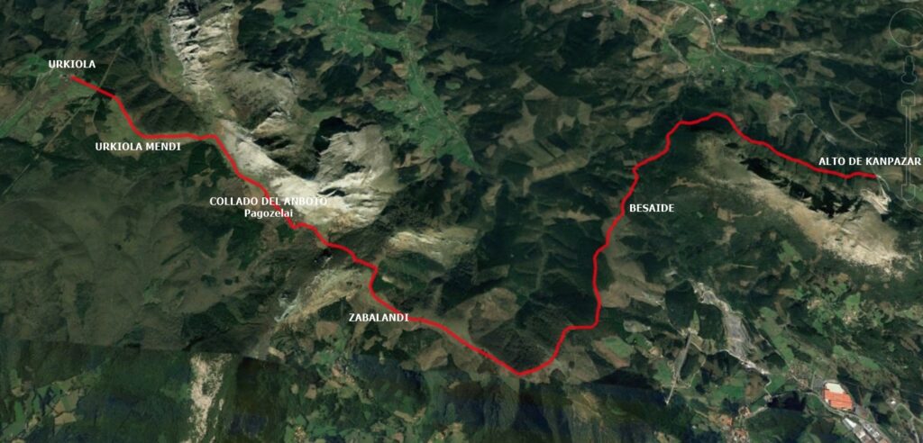 Irteera,  Urkiola mendatetik (710 m.) –Urkiolagirre gaina(1.011 m.) – Asuntze (875 m.) –Pagozelai (995 m.) – Zabalandi (880 m.) – Ipiztegarriaga (725 m.) – Besaide (555 m.) – Kanpazar (465 m.). Urkiolatik Zabalandiraino GR 12 bidea hartzen da. Zabalanditik Kanpanzarreraino GR 123 bidea hartzen da. Besaiden hamarretakoa.