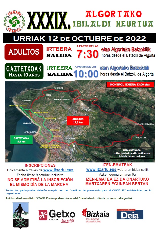 Iazko ibilaldi arautuan pandemiaren ondorioz egindako egokitzapen batzuekin lortutako arrakastaren ondoren, aurten Itxartu Mendigoizale Taldea Algortako Ibilaldi Neurtuaren XXXIX. edizioa antolatzen ari da, tradizioz partehartzaile ugari biltzen dituena 17,3 Km Helduak ibiltzeko eta 5,9 Km Gaztetxoak, Algorta inguruan. Aurreikuspenen arabera, 2021eko urriaren 12a, asteartea, izango da ohiko eguna.