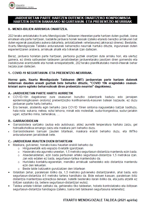 Irakurri “ITXARTU MENDIGOIZALE TALDEAREN IRTEERETARAKO JARRAIBIDEAK ETA PROTOKOLOA, COVID 19REN AURKAKO PREBENTZIO-NEURRIEKIN”.